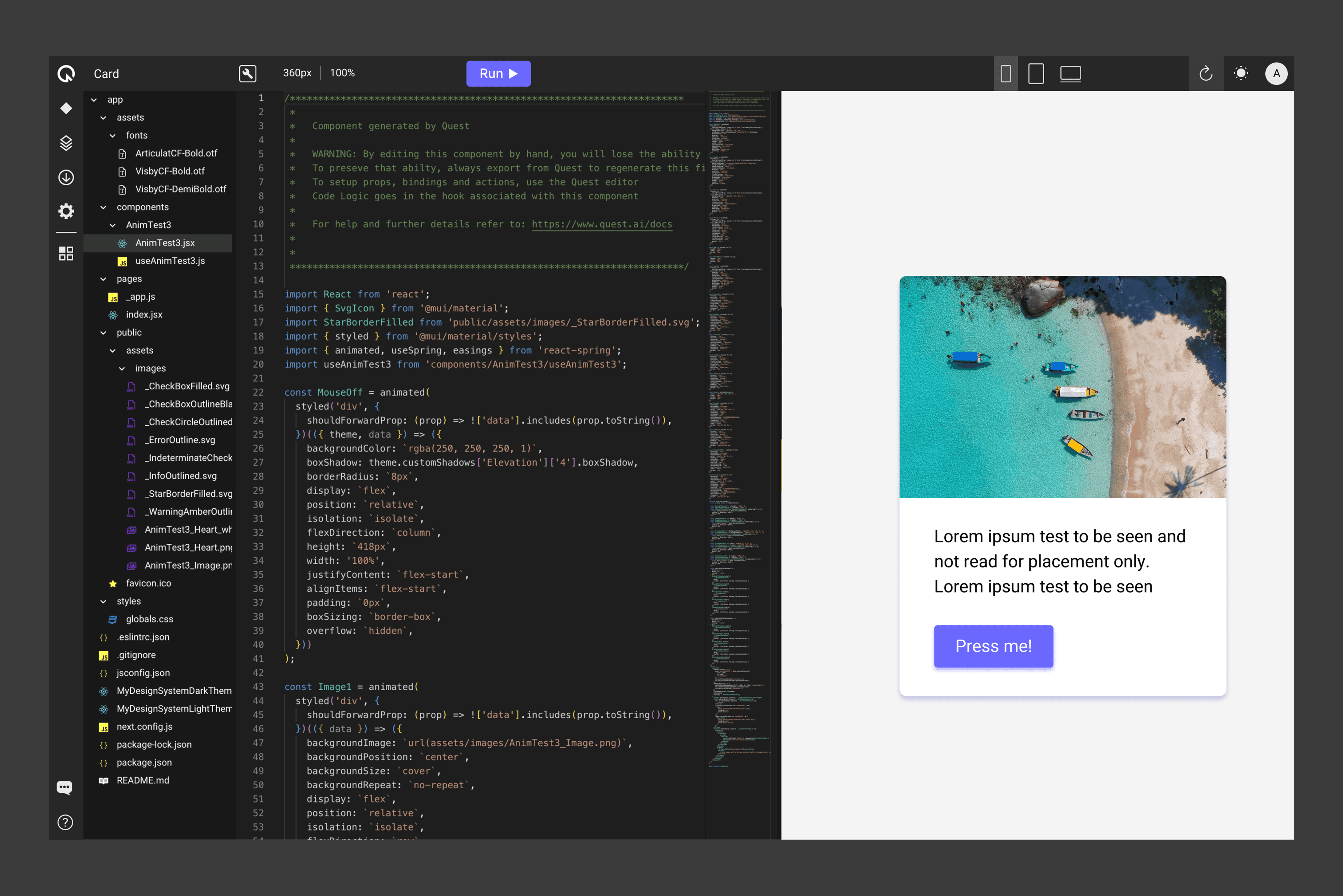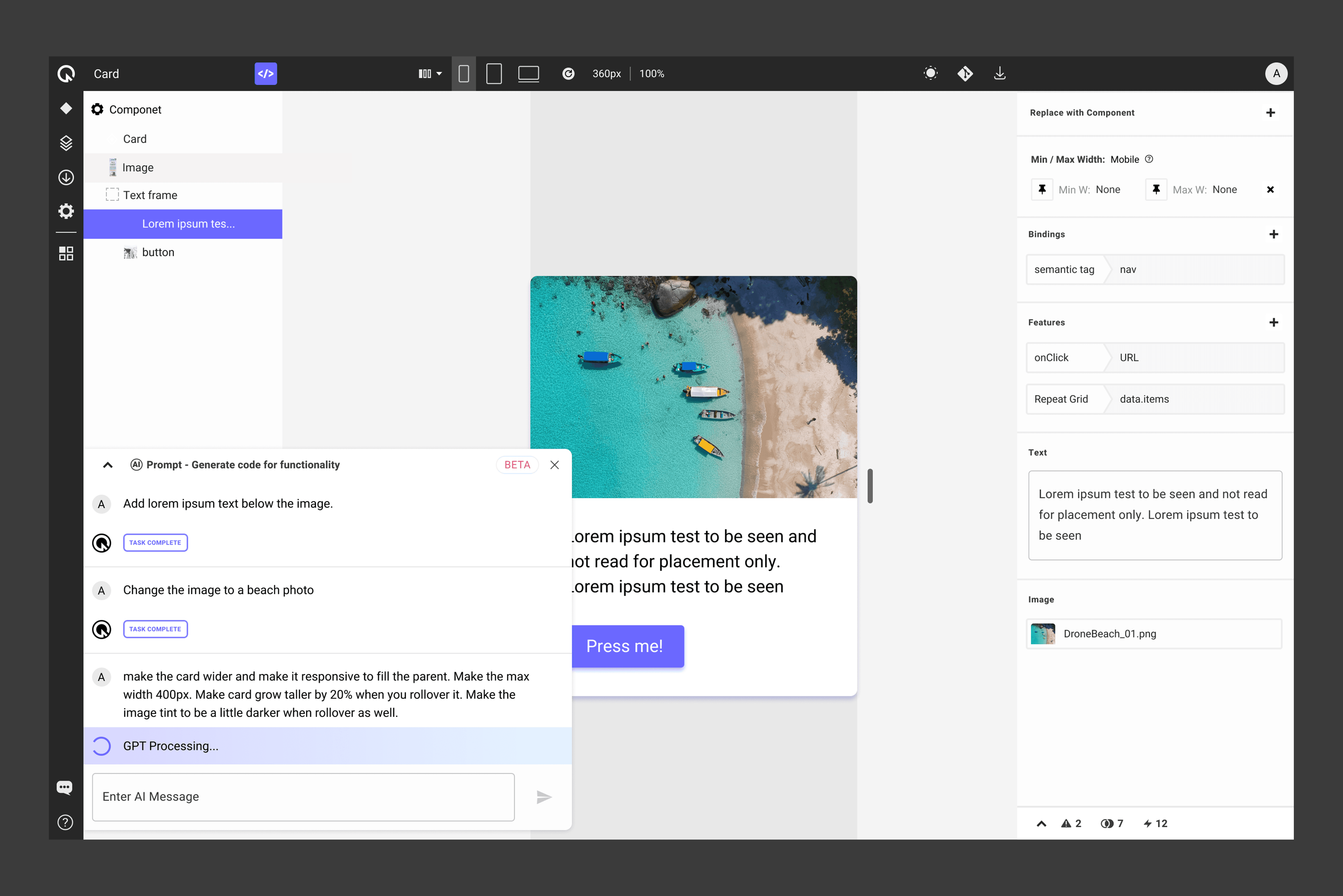 This is the Quest Visual Editor where you can first check out the Figma-to-code translation. This example also showcases the ChatGPT integration where users can ask it to make changes, write logic and connect to their database.
