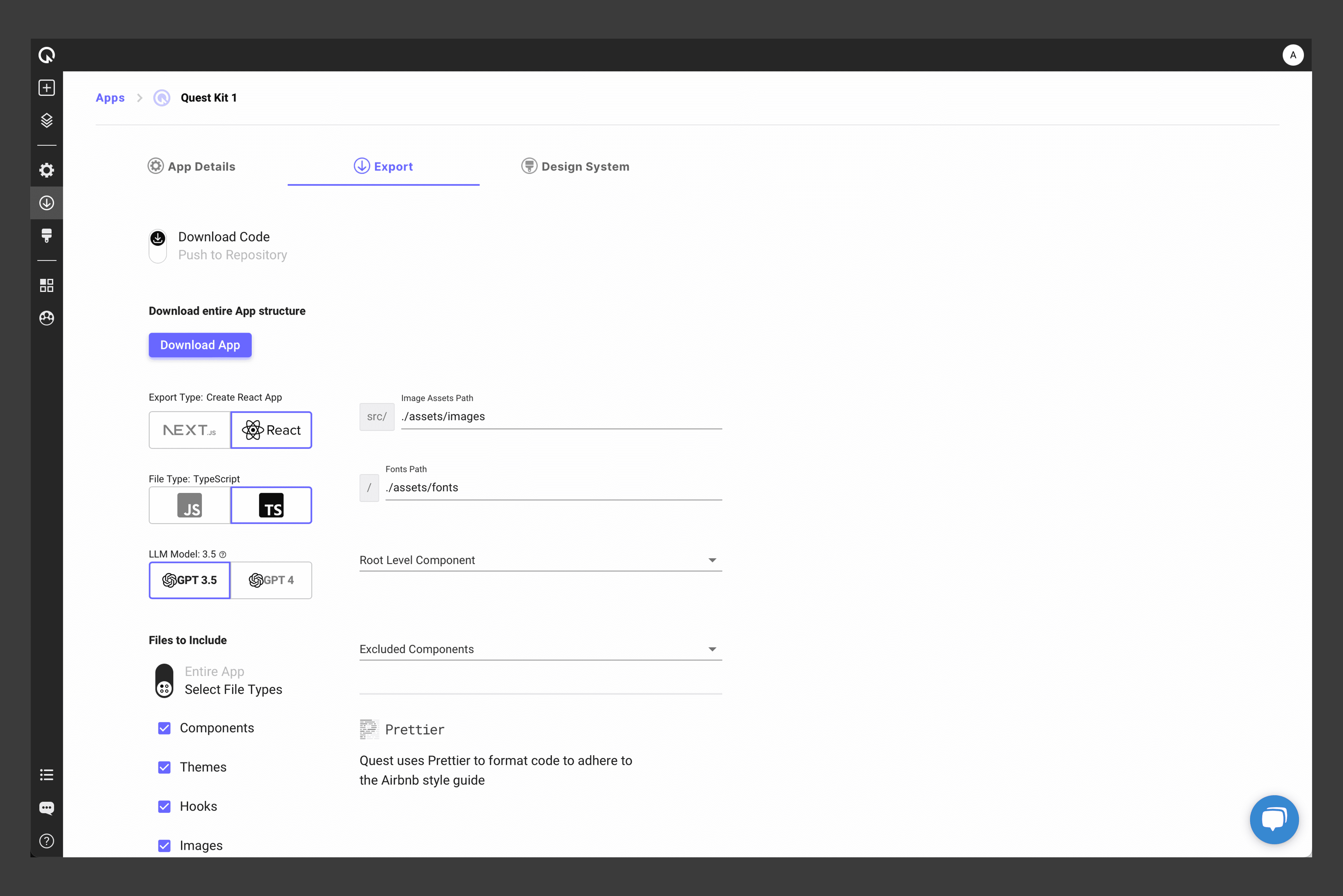 This is the Export tab. Here is where you choose what specific App settings you want the code to be set to. Also, this is where you connect your GitHub repo for syncing individual components or the entire app all at once.