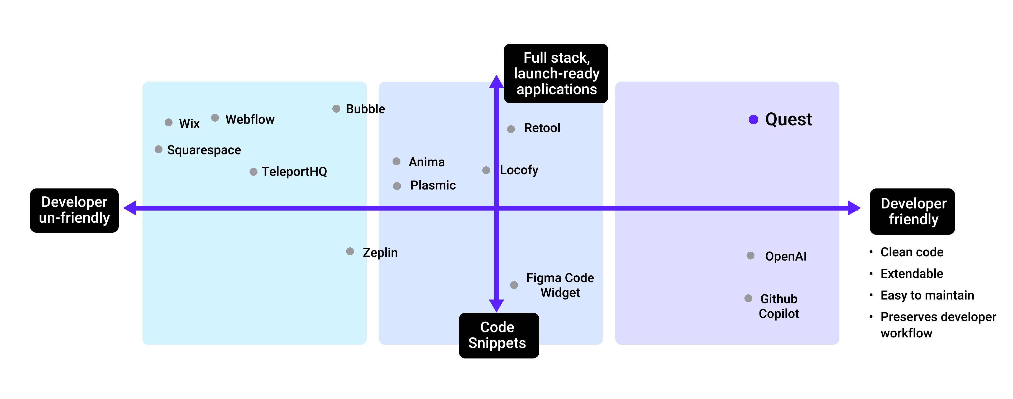 Quest is a nocode developer platform that converts Figma designs into ReactJS with AI. In mid 2022, our startup decided we were going to focus primarily on ReactJS (formerly HTML) and that shift would require a new brand web app. The new product needed to have features & messaging that would resonate with developer needs.