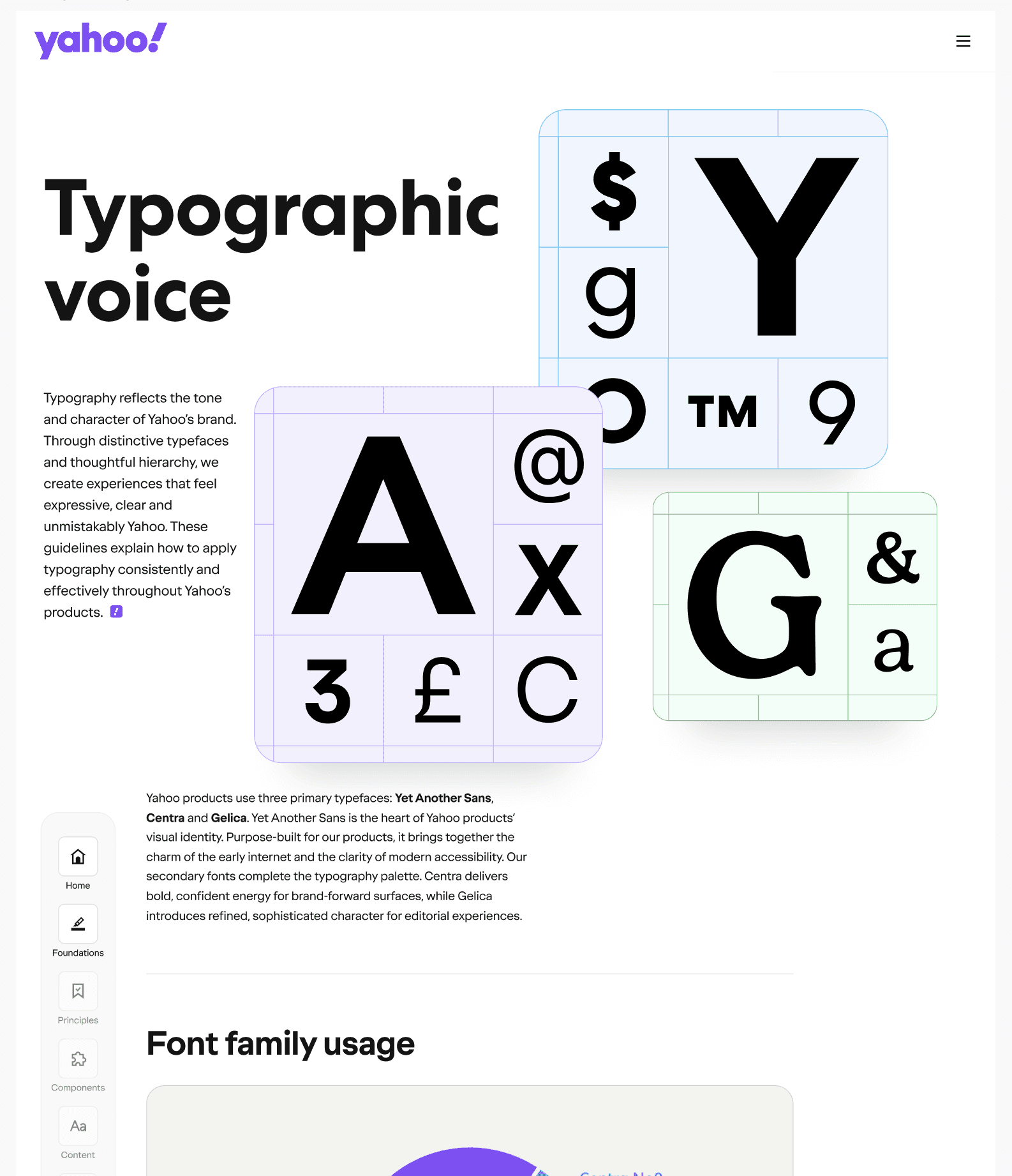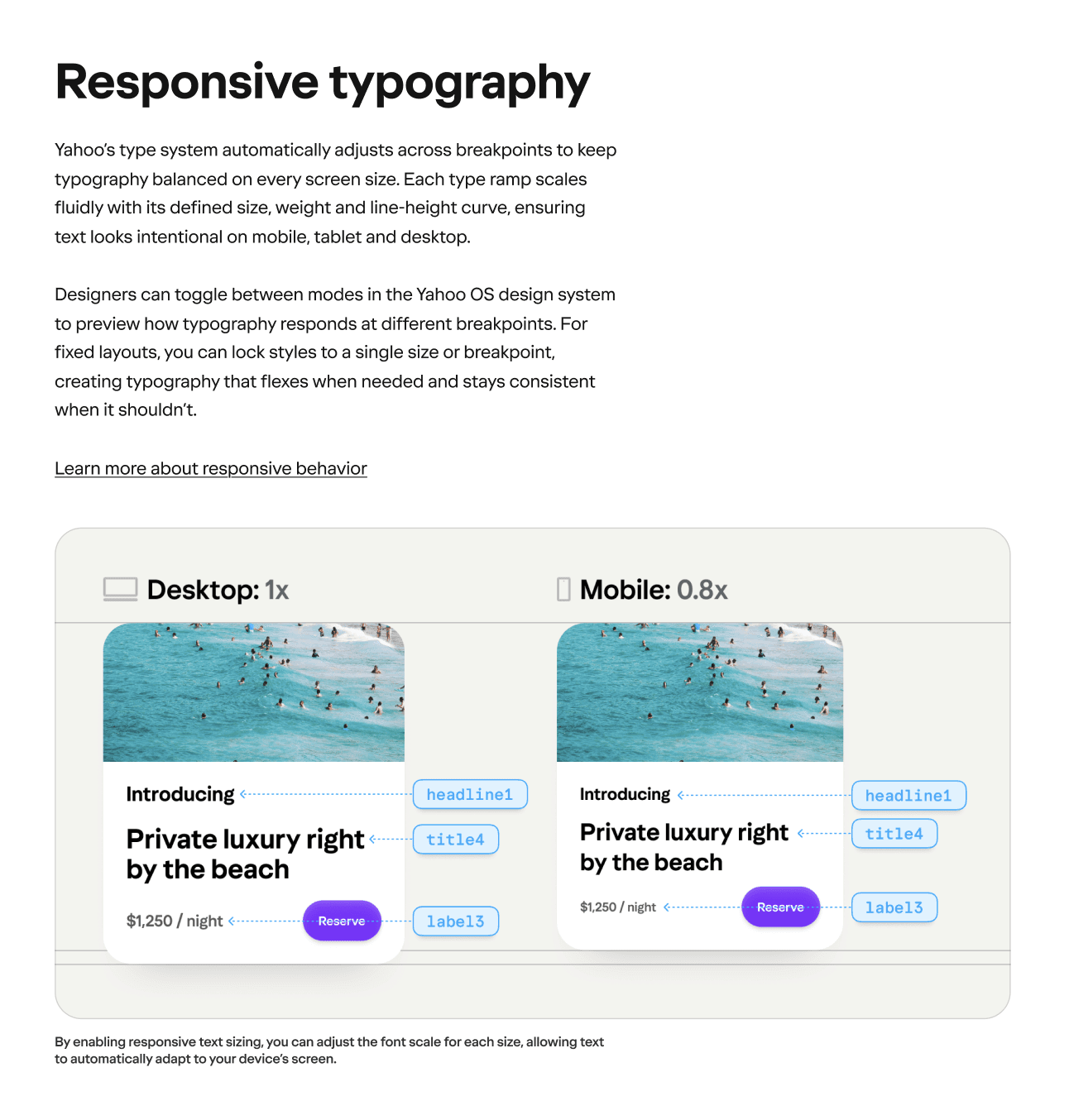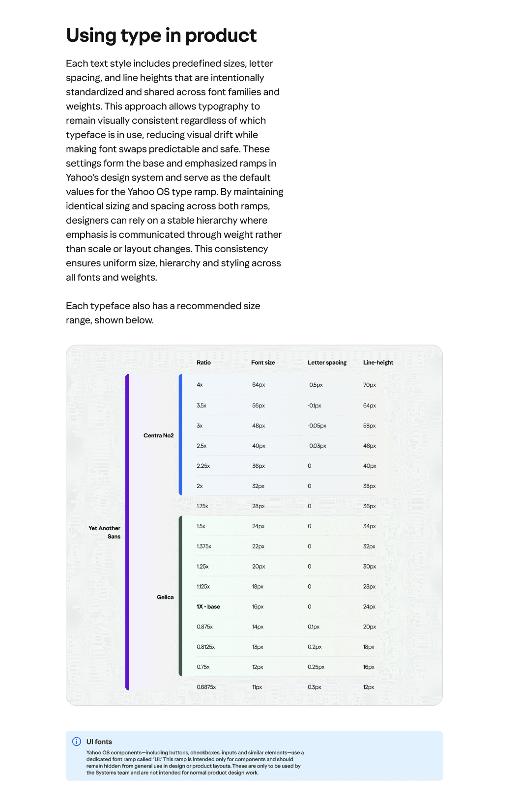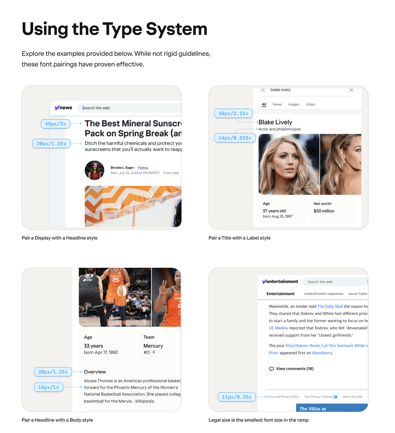 One of our proudest achievements is the Yahoo Design System documentation site. I spearheaded the creation of an extensive style guide website (built on Figma’s Design Docs platform, with a lot of custom code for branding). This site serves as a one-stop hub for everyone – it outlines our design principles, visual guidelines, and detailed specs for every component. We included sections for spacing scale, color palettes and gradients, typography ramps, iconography, illustration style, accessibility standards, and even content guidelines for tone of voice. (We took inspiration from the excellent eBay Design Playbook site) The documentation is interactive and always up to date with the latest Figma assets, which has been amazing for onboarding new designers and keeping engineers aligned on the intended behavior of each UI element.