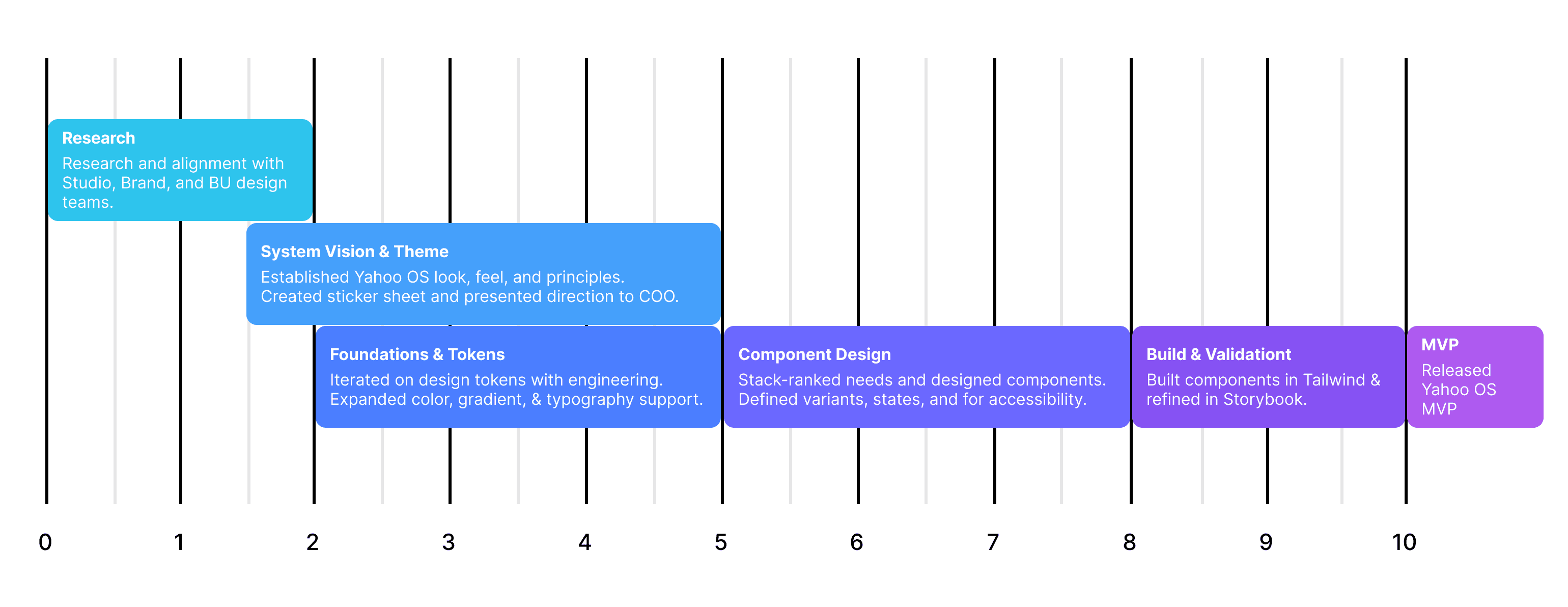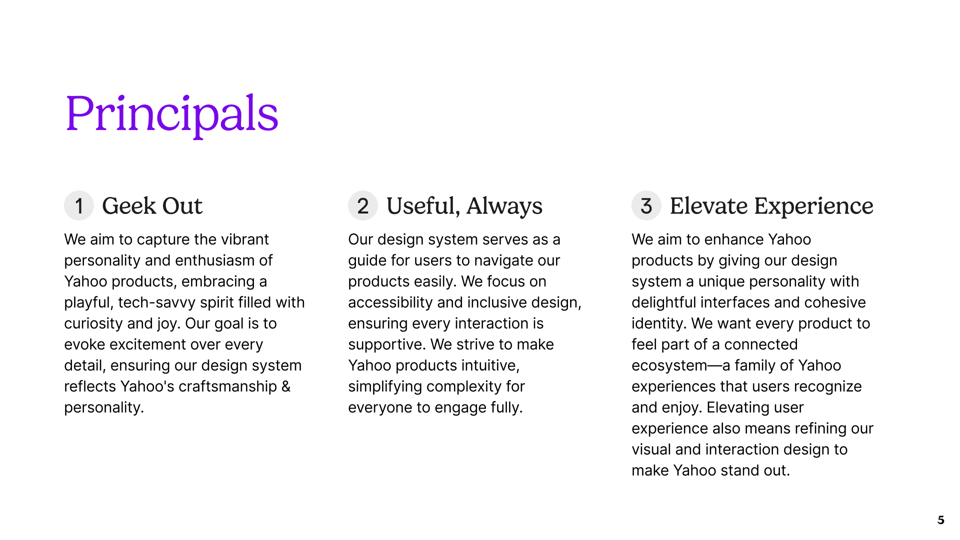 Early in the process, we defined core design principles to guide Yahoo’s new design language – from embracing a playful, tech-savvy spirit (“Geek Out”) to ensuring every interface is intuitive and accessible (“Useful, Always”). These principles helped us maintain Yahoo’s unique personality while building a practical, cohesive system.