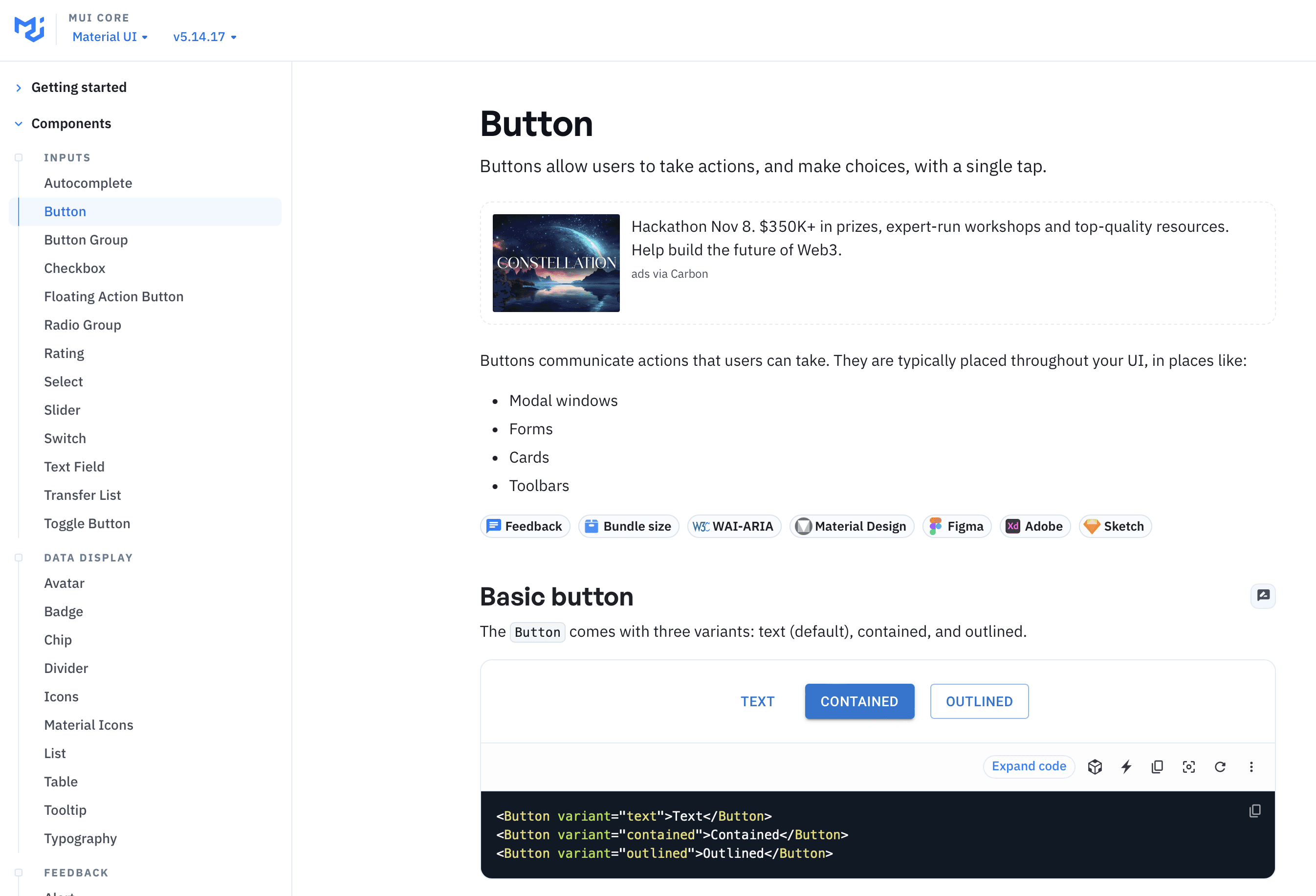 By looking through the MUI docs, we were able to start to identify all the different parameters that were included in each component so that we could included them, properly named as properties in the Figma component and variants. For instance, for button, we decided to support all 3 button variants for "text", "contained" and "outlined".