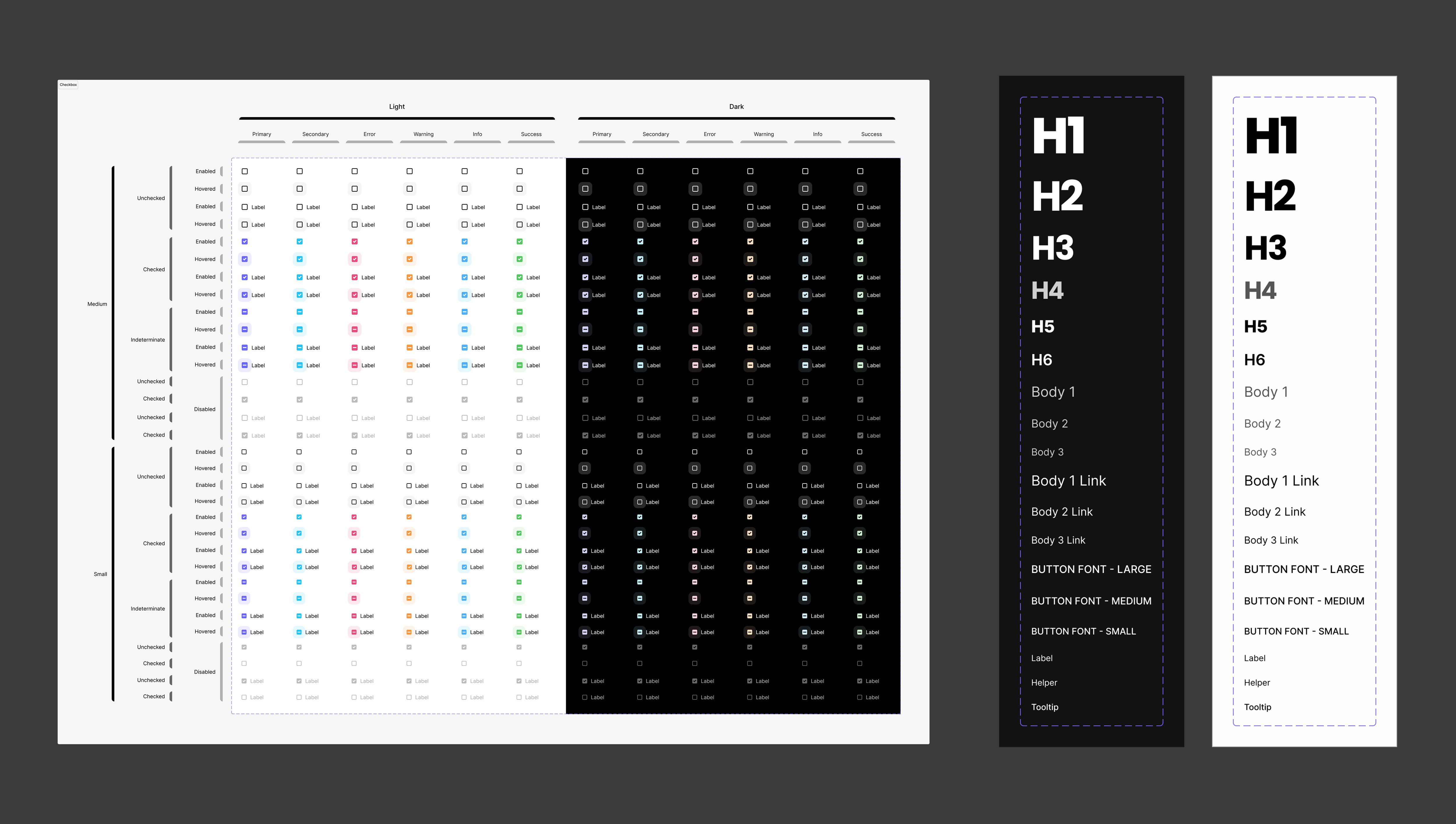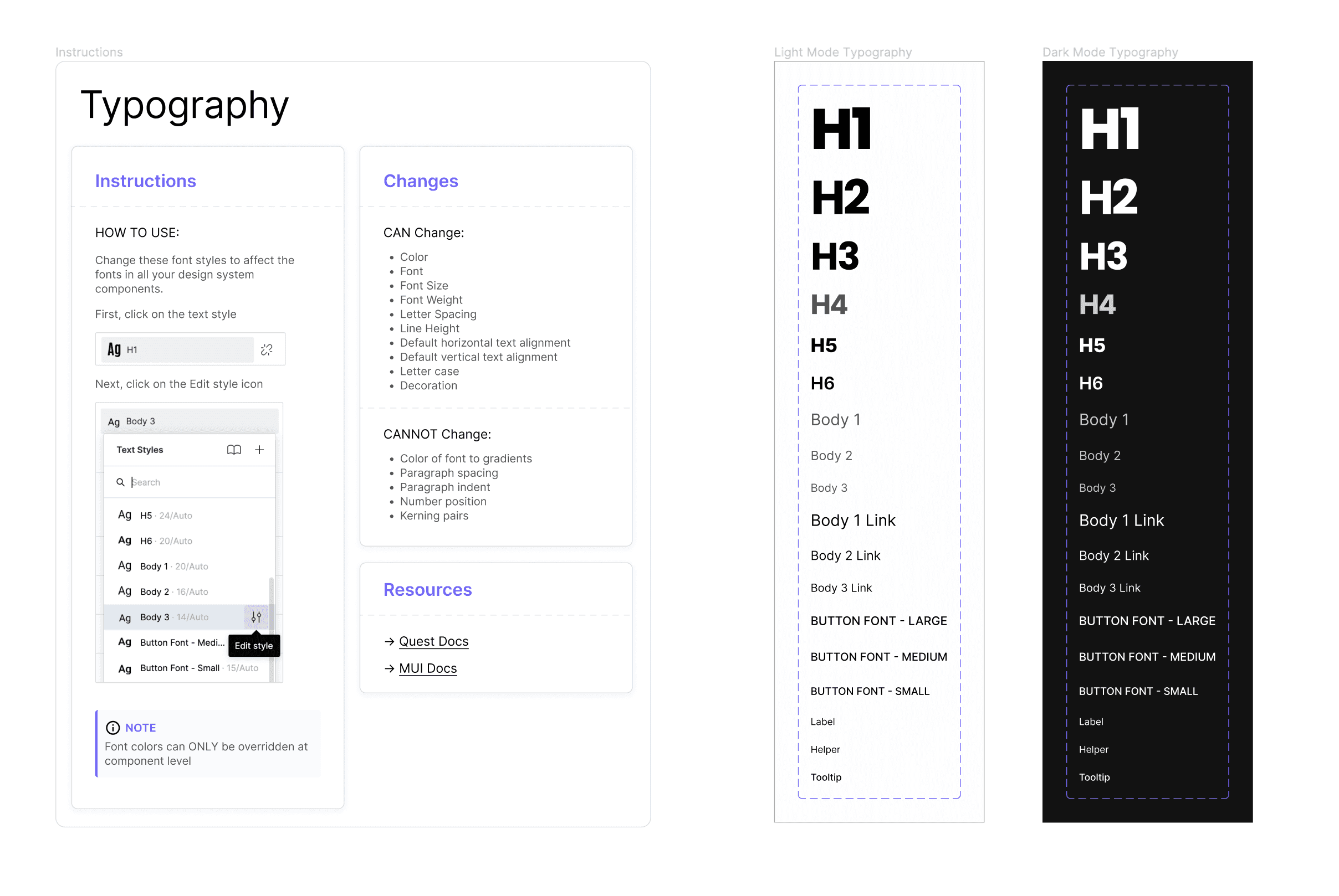 To begin designing the kit in Figma, I first set out to establish the fonts, colors and effects that would be used as styles in Figma for users to later easily replace. By looking at what MUI standard fonts were, I created text styles to match and gave my own font treatment to match our Quest brand. Next, I did the same with colors, finding the sets of colors that were used in the MUI theme and created styles for all of them. Similarly, I did this for drop-shadows as well for things like button and card components.