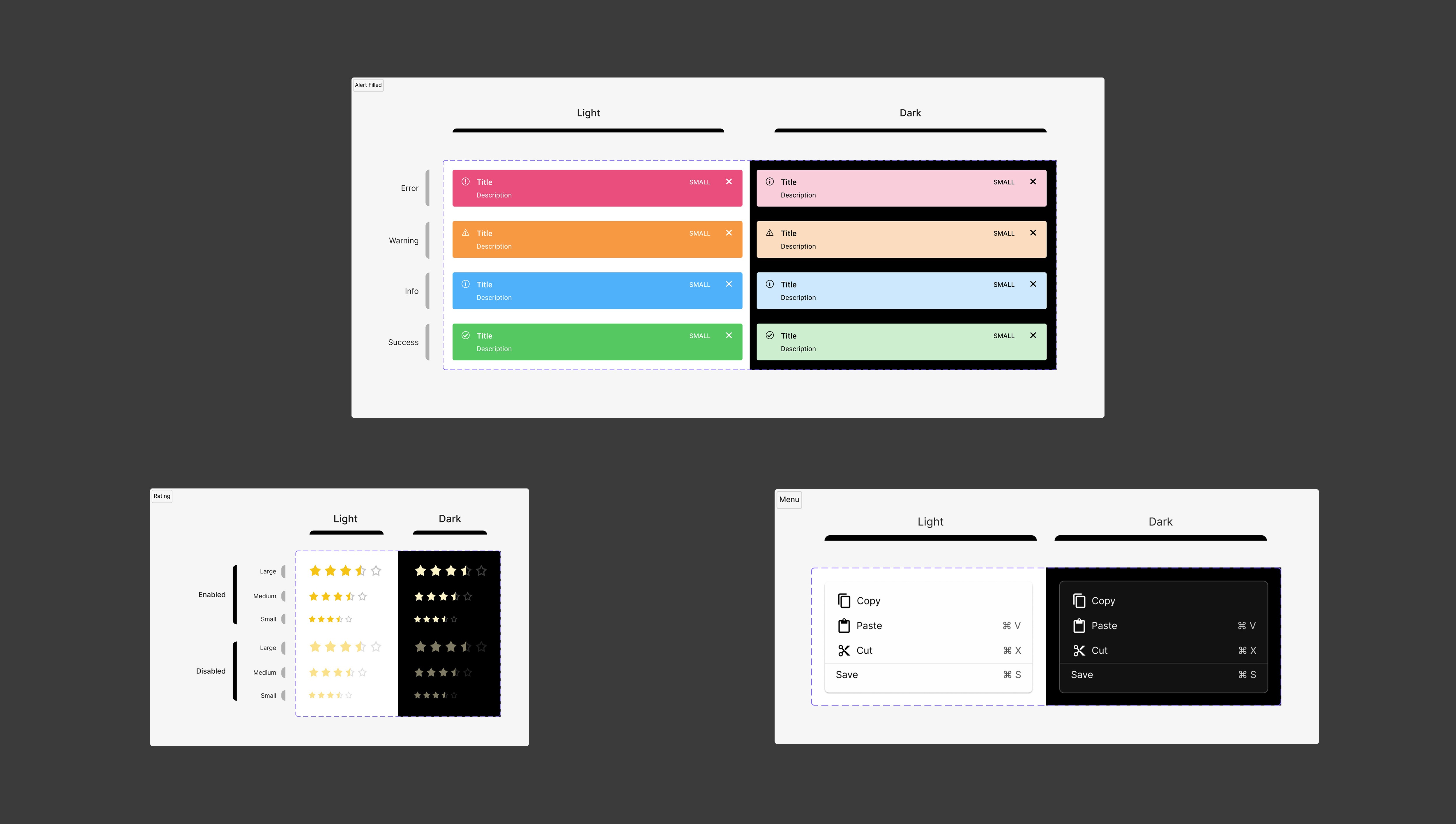 I began by building some more well known components such as button, alert and avatar. This helped me start to see where I needed to add atoms to the component library as well. For instance, I need to make an icon component / atom for icons in alert and avatar. Icons proved the most tricky part of the process, because while easy to design, we quickly discovered a lot of technical limitations of allowing a user to use any custom icon they wanted. We ended up reverting the idea of allowing customers the ability to modify or create new icons and stuck directly with the MUI icon library icons only because of issues with SVG rendering and unforeseen light/dark mode issues.